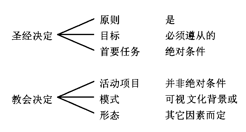 注意:教会在为了开展其事工而制定符合文化背景的形态、模式、组织或方法的时候,必须要满足两个先决条件: