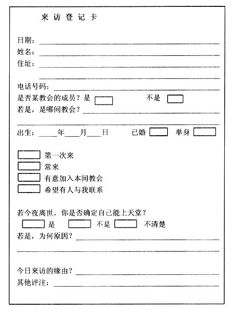 应当设计一份“来访登记卡”,在举行敬拜仪式的时候发出去,这样才能获知各位来访者的基本情况,了解他们的需要、知道他是不是基督徒、有没有可能加入本教会。