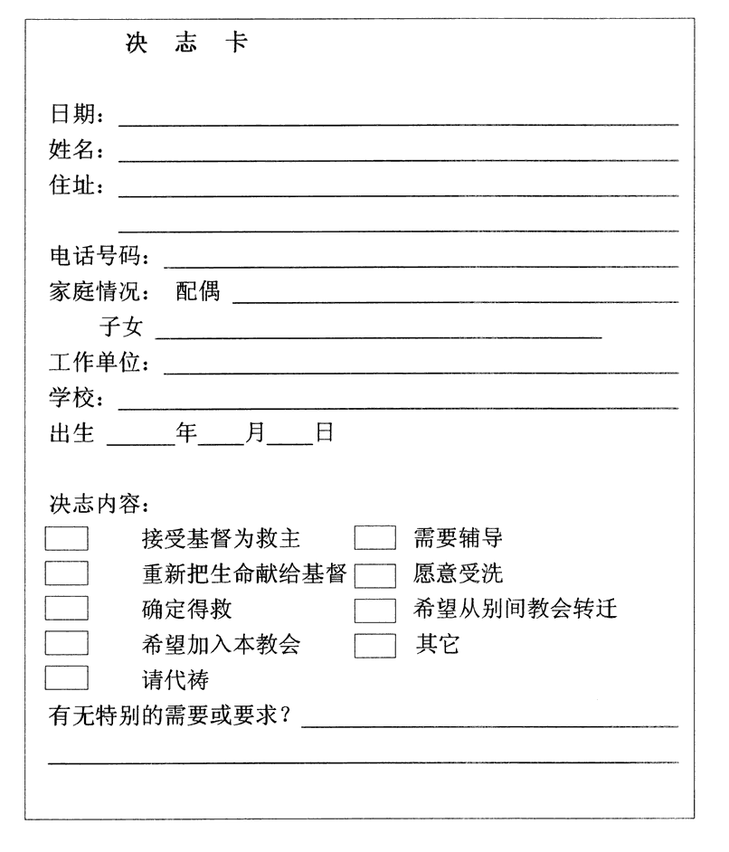 ◇要请他填一份决志卡,这为以后的栽培工作提供一些基本信息,并能显明此人的需要。