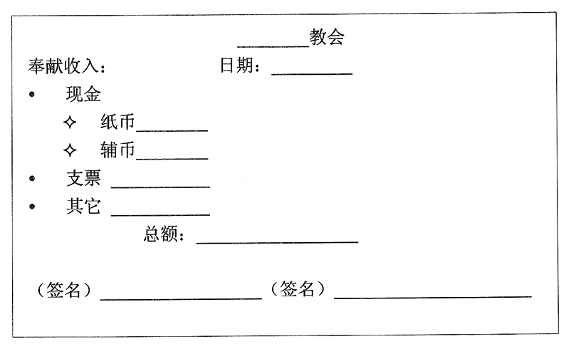 o 所有的献金都要数算清楚,并要作简单的登记。比如: