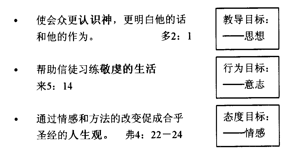 在达到这个目的的过程中,教会的圣经教育应以三个相互关联的目标为核心: